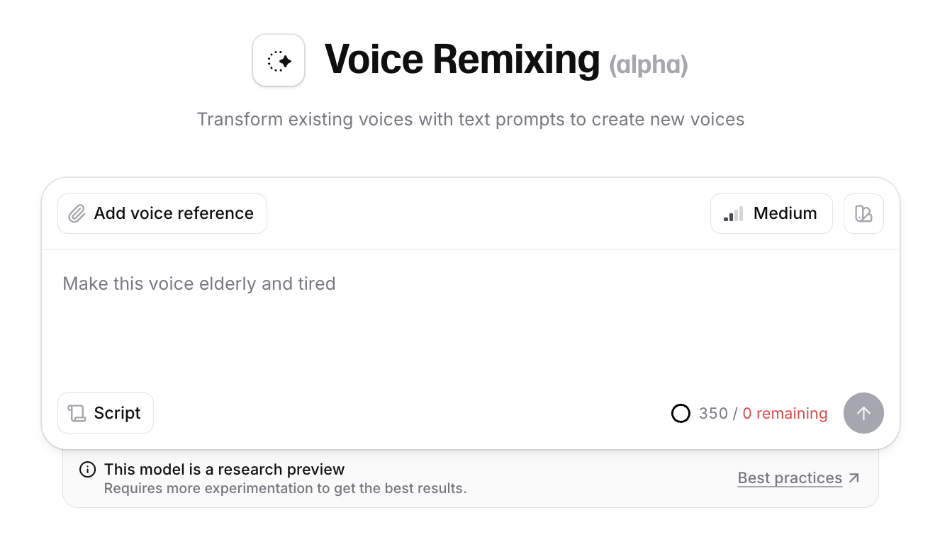 - Voice Remixing: 랜덤 생성 기능과 더불어, 내가 이미 가지고 있는 목소리(IVC, PVC)를 베이스로 성별, 나이, 억양, 속도 등을 수정하는 것